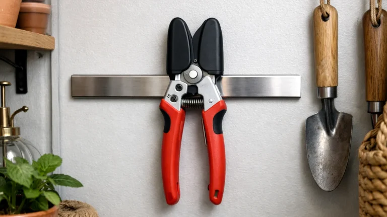 Esistono alcune strategie concrete che funzionano anche quando lo spazio è davvero ridotto. La prima è l’utilizzo di portautensili magnetici a parete: strisce magnetiche progettate originariamente per i coltelli da cucina reggono perfettamente anche le forbici da potatura, le tengono visibili e accessibili, e non occupano superficie orizzontale. Bastano pochi centimetri di parete libera, anche in un ripostiglio stretto.