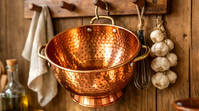 Il materiale fa tutta la differenza. Un colino in rame martellato porta in cucina una texture calda, artigianale, che dialoga bene con superfici in legno naturale o piastrelle in cotto. L’acciaio inox lucido, invece, funziona perfettamente nelle cucine moderne e minimaliste: la superficie riflettente aggiunge luce senza appesantire. Chi preferisce un look più rustico o nordico può orientarsi su modelli con manici in legno naturale, che ammorbidiscono l’aspetto metallico e rendono il pezzo immediatamente più domestico e accogliente.